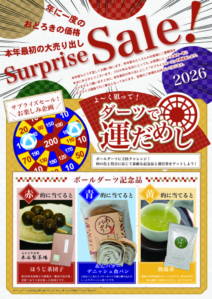 サプライズセール 公開日 2025.12.11 本年最初の大売り出し! ※写真はすべてイメージです。店舗により、取り扱い商品が異なる場合がございます。 また、一部の店舗で取り扱いのない商品がございますことを、予めご了承ください。